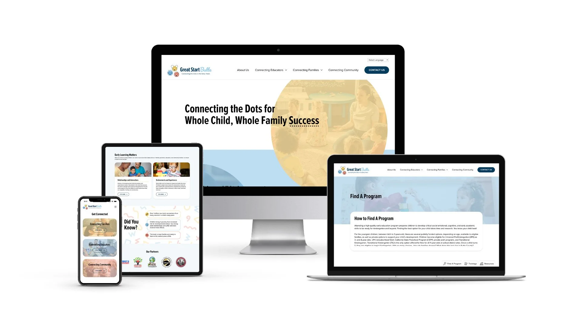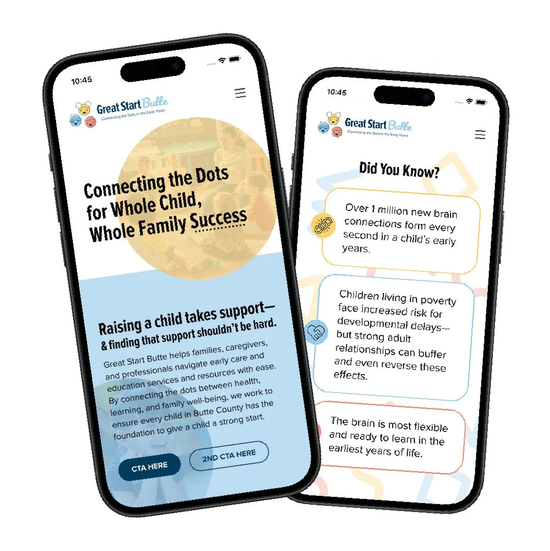Great Start Butte is an integrated hub for early childhood services in Butte County. The goal of the logo portion of this project was to create a unique, locally resonant visual identity that reflects the mission of Great Start Butte while ensuring it aligns with California’s Universal Pre-K (UPK) branding guidelines. We also created a website for Great Start Butte that felt modern, friendly, and timeless, and that aligned with their new logo and branding guidelines.